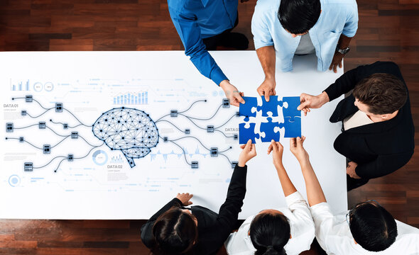 Team members collaboratively solve a puzzle over a table featuring a brain graphic and data visualization, highlighting the importance of teamwork in strategic innovation sessions. Trope