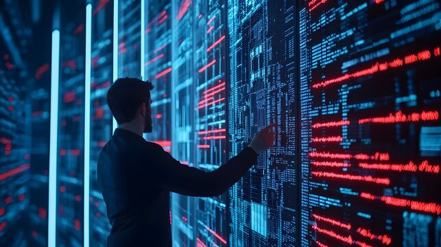 Forensic Expert Analyzing Hacked Server with Data Streams Highlighting Fraud Detection