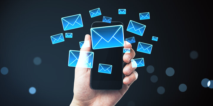 Hand holding smartphone with floating email icons representing digital communication and online messaging on dark blurred background.