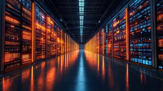 Futuristic smart manufacturing concept with blue and white delivery trucks on the road carrying cardboard boxes in a data center, photorealistic 3D rendering.