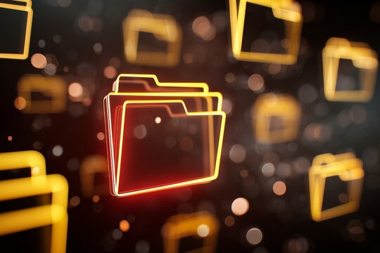 Glowing futuristic folder icons with red neon edges floating over a dark cyberspace background, concept for data security, digital storage and cloud computing solutions