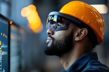 Construction worker analyzing data on digital network interface