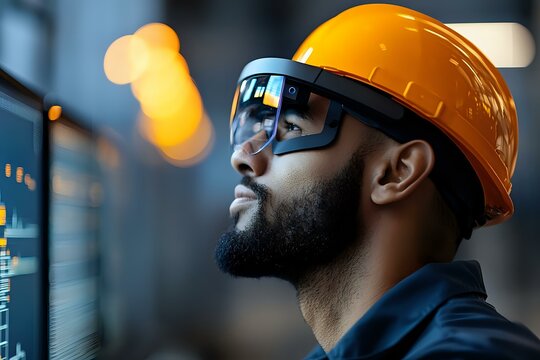 Construction supervisor communicating with futuristic digital overlays