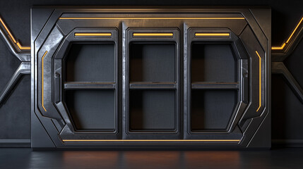 Futuristic sci fi wall panel with glowing orange lights, metallic texture, and geometric compartments in a dark industrial setting