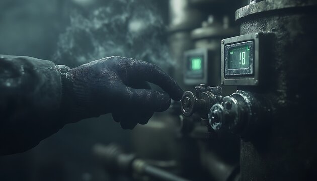 Futuristic industrial interface with digital data visualization
