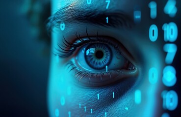 Closeup view of womans eye. Blue digital code overlayed on eye. Futuristic tech interface. Concept of biometrics, cyber security. Woman eye highlighted in center of digital interface. Abstract
