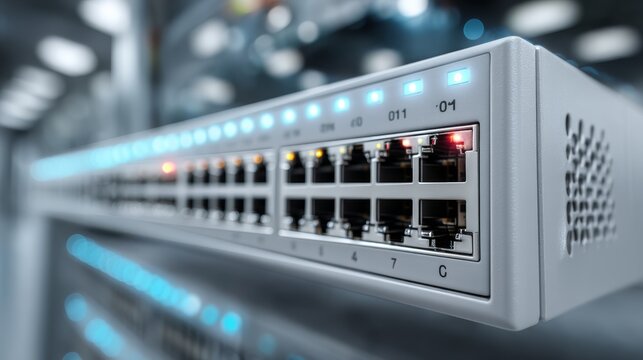 A close-up view of a network switch with illuminated ports, showcasing a modern data center environment.