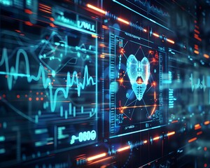 AI integrated medical security, A futuristic visual a circular neon display with heartbeat signals and lock icons, health and digital security