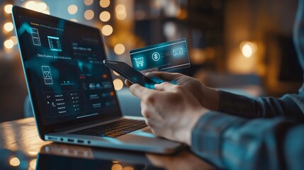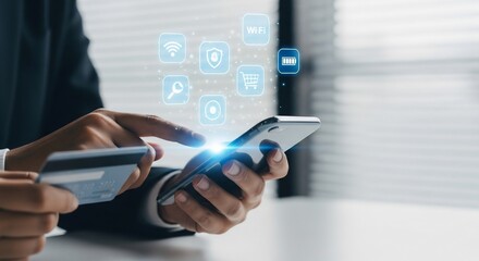 A person using a smartphone to seamlessly integrate digital banking and online shopping with a futuristic user interface.