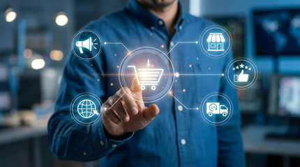 Professional,businessman,using,omnichannel,retail,network,on,virtual,screen,connecting,online,shopping,cart,with,global,logistics,and,marketing,icons,for,seamless,ecommerce,business,experience.