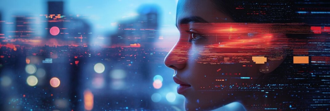 A digital overlay on a profile merges technology with a vibrant urban backdrop.