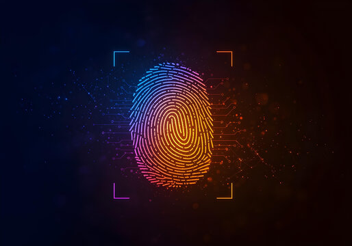 Digital fingerprint in abstract design with glowing elements on dark background, symbolizing identity and security