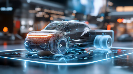 Autonomous vehicle showcase digital garage wireframe truck model neon blue illumination futuristic environment 3d visualization