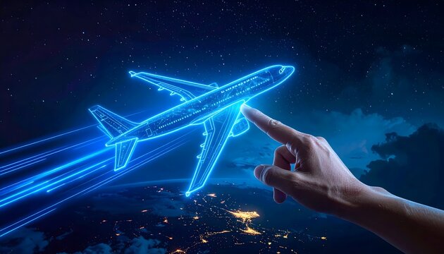 Futuristic Touch Interface Hand Interacting with Neon Blue Airplane Hologram Over Cityscape at Night
