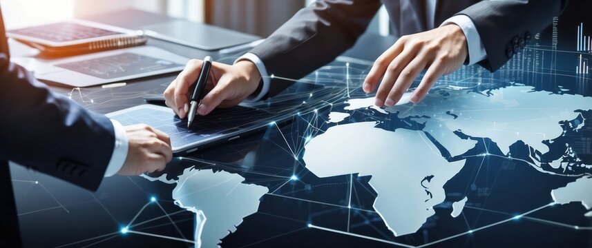 Two business professionals collaborating over a digital map, symbolizing global strategy and technological innovation in the corporate world.