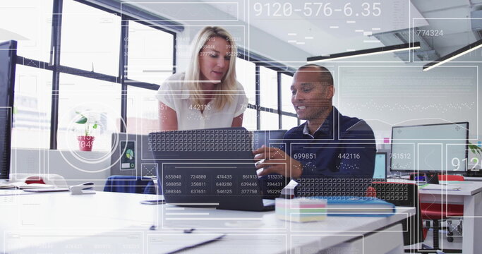 Data processing on interface over diverse architects discussing blueprints at meeting