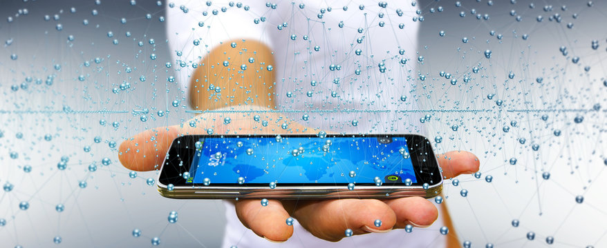 Businessman holding flying abstract sphere over mobile phone 3D rendering