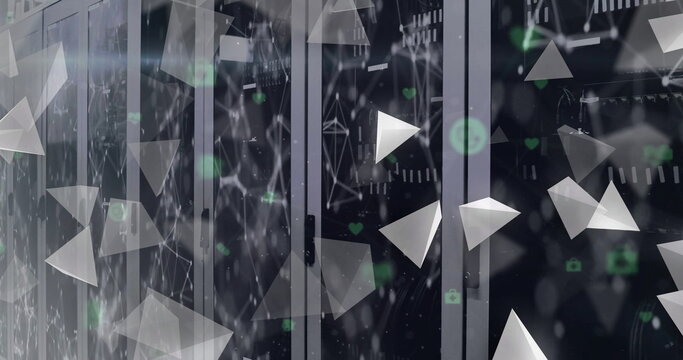 Image of floating 3d grey pyramids, green icons and networks over computer server room