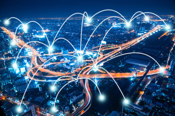 A finger touches a glowing network connection point over a blurred cityscape at night representing future technology