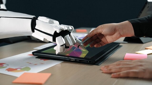A striking scene of a human hand interacting with a robotic hand over a digital tablet, symbolizing the integration of technology in creative processes and teamwork.Noogenesis