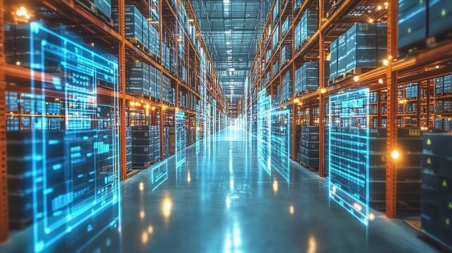 ARenhanced warehouse management, packages moving on conveyors, glowing digital overlays, advanced technology, efficient sorting