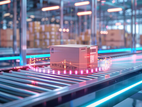 Packages moving on conveyor belt in an automated warehouse