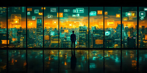 An image depicting a man standing before a futuristic cityscape with a complex digital interface overlay