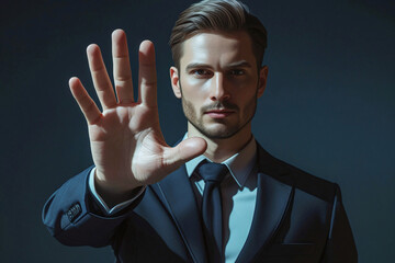 business man push and point forefinger and show hand up while standing with digital service data center server background for modern technology infographic hud overlay concept