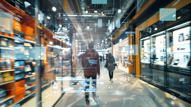 Futuristic interface overlayed on a modern shopping mall.