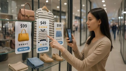 Shopper Using AR Smartphone in Mall with Floating Product Info