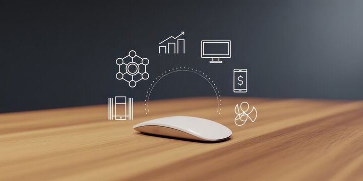 Digital wellbeing in workplace concept. Using a computer mouse, overlaid with icons representing digital wellbeing, healthy work-life balance. Promoting a healthy relationship with technology.