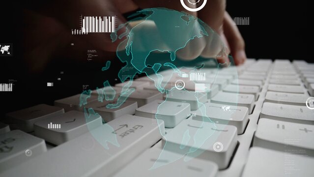Hands interact with a keyboard while a digital globe and analytical graphics overlay create a dynamic representation of technology and global connectivity in a modern workspace. Xenic