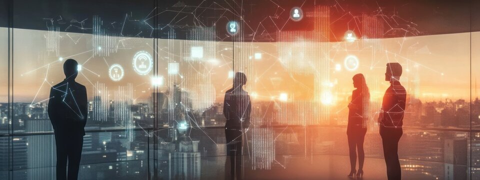 Silhouettes of four business people standing in a modern office with city skyline at sunset and digital technology holograms overlayed, evoking innovation and collaboration