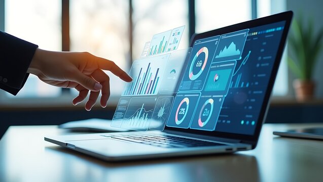 Person's hand interacting with floating digital data panels on a laptop screen technology interface