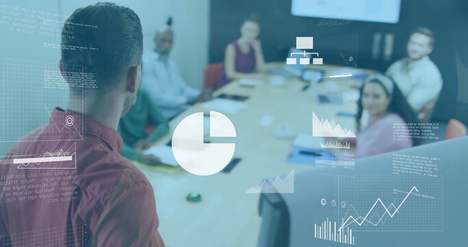 Image of charts processing data over caucasian casual businessman presenting at office meeting