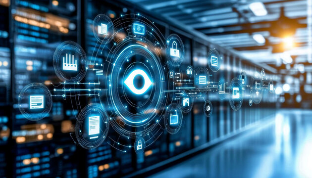 Digital eye monitoring data privacy in server room, showcasing security icons and information flow. This represents importance of data protection and privacy in technology