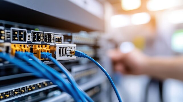 A modern server room is depicted with an arrangement of blue and orange cables plugged into network hardware, representing orderly digital connectivity and data flow.