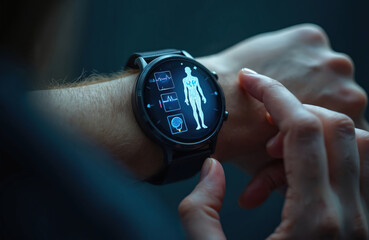 Person using smart watch for sport healthy lifestyle statistic data analysis tracker fitness monitor concept