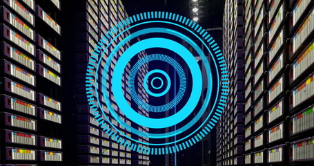 Image of blue round scanner spinning against computer server room