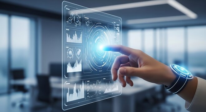 Innovative digital interface showcasing advanced data analytics and AI driven insights, with a human hand interacting with a futuristic holographic display in a modern office setting.
