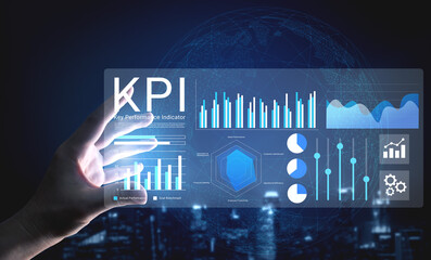 A dynamic and futuristic business dashboard showcasing key performance indicators with various graphs and charts in a digital environment. Ideal for business presentations. Gantry