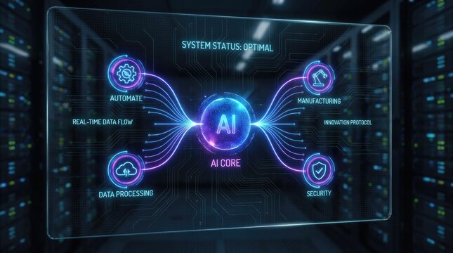 AI core system displaying automation, manufacturing, data processing, and security on a server room background
