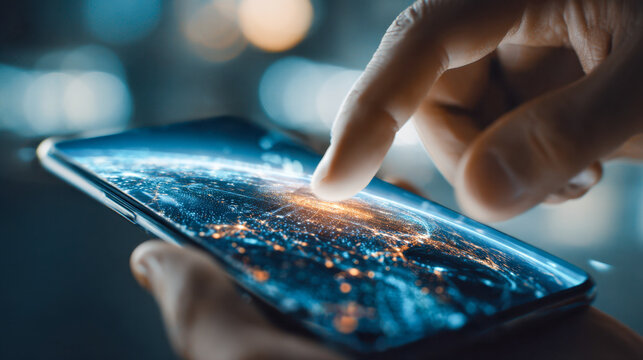 Human hand interacting with smartphone displaying digital network visualization and glowing connection points representing global communication and technology advanc