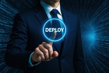 A businessman using innovative technology to deploy code illustrates strategic decision-making for efficient digital growth and leadership