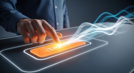 Focused hand presses glowing orange button labeled "launch" on futuristic digital interface, initiating cascade bright blue white light waves emanating outwards, for innovation new