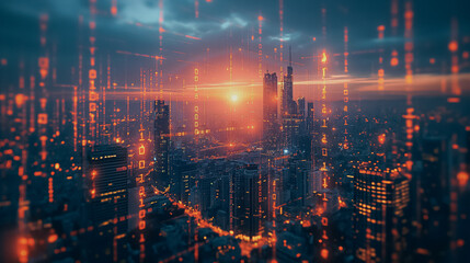 Image of a city skyline at night with vibrant neon colors and a digital grid superimposed on the scene