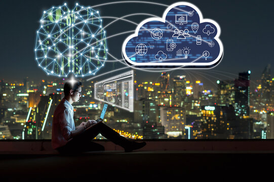 Asian businessman sitting and using the laptop and working with brain and virtual screen connecting with cloud technology over the cityscape background at night time, Business and technology concept