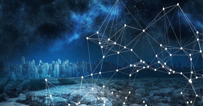 Virtual connections overlay urban cityscape for digital interfacing and, data visualization backgrou