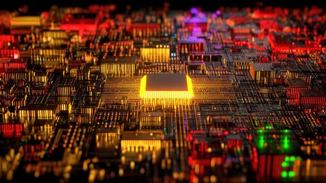 Highly detailed close-up digital circuit board with colorful illuminated electronic components and integrated microchips, futuristic technology background
