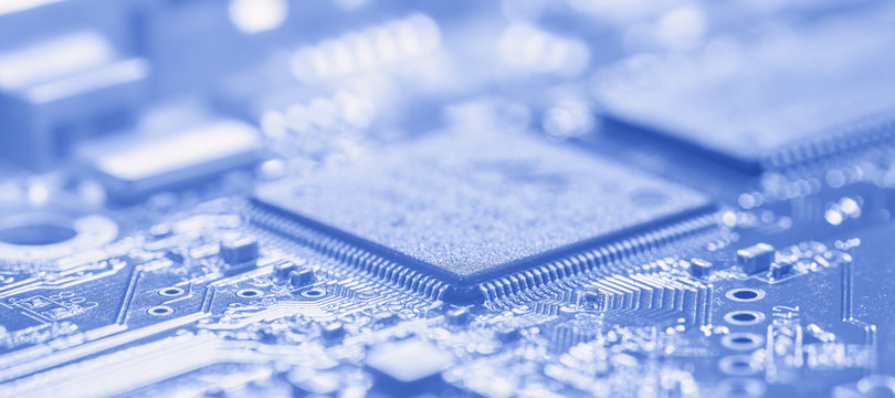 Microchip and printed circuit board in soft focus. The photo toned blue.